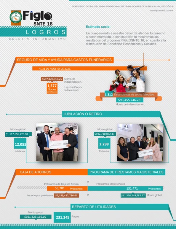 Estimado socio, Consulta la Reseña de Logros de Figlosnte 16 con corte al 31 de agosto de 2025.